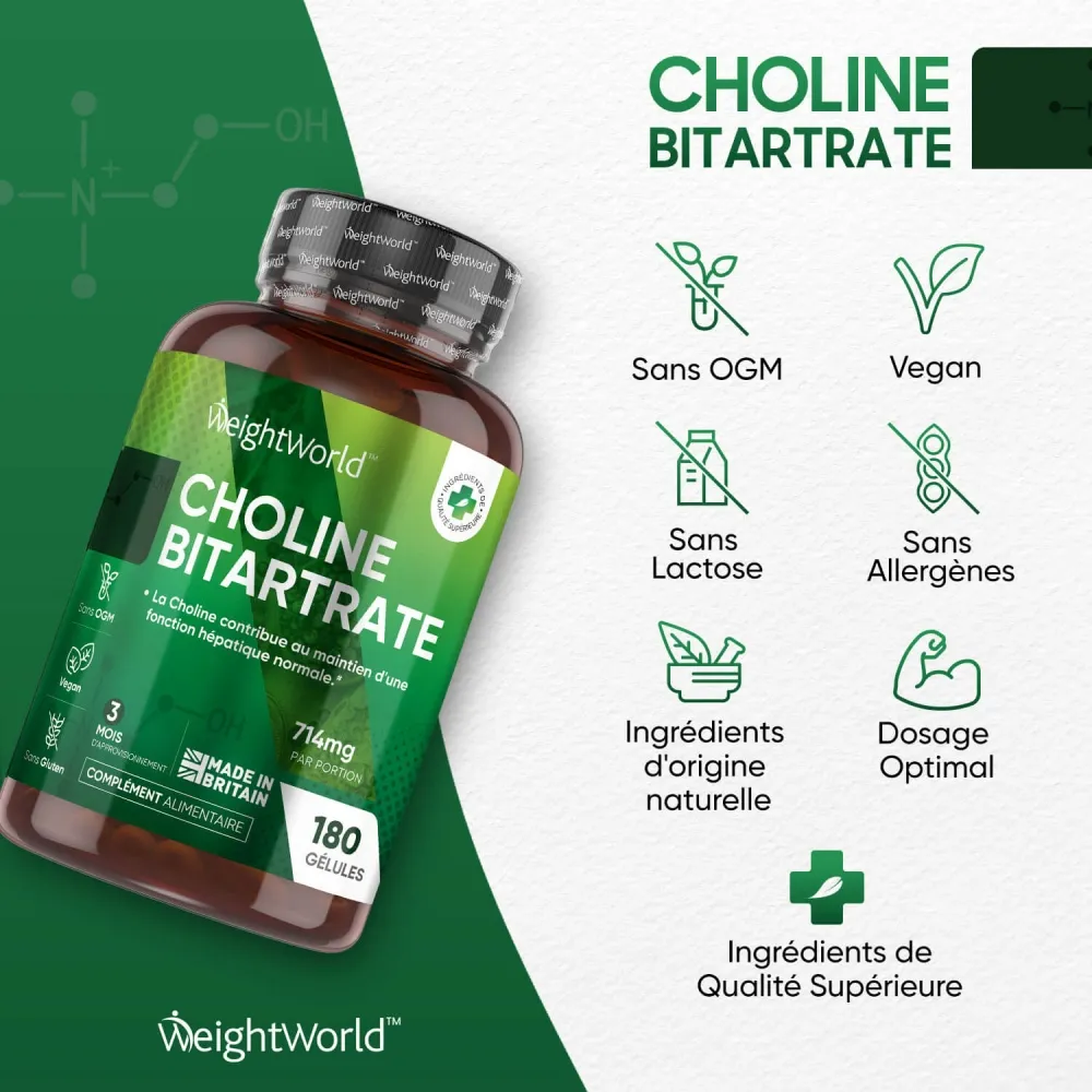 Prendre deux gélules de Bitartrate de Choline par jour avec un grand verre d'eau, de préférence pendant un repas pour faciliter l'absorption.