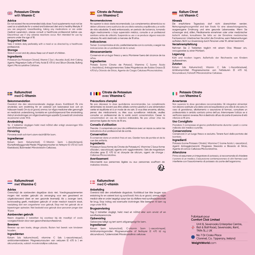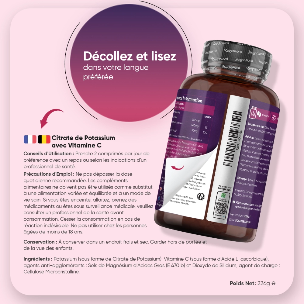 Il existe différentes formules à base de citrate de potassium. Celui de WeightWorld se distingue par l'association avec 80 mg de vitamine C par dose. Cette combinaison inédite a été soigneusement élaborée pour vous proposer un apport complémentaire en potassium et en vitamine C. Conçu avec une attention particulière portée à la qualité et à la biodisponibilité, ce produit s’intègre facilement à une routine nutritionnelle équilibrée. Notre formule complète est pensée pour ceux qui souhaitent aller au-delà d’un simple apport en potassium.