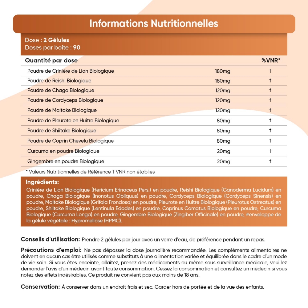 Pour tirer pleinement profit du Complexe de Champignons Bio, il suffit de prendre 2 gélules par jour avec un verre d’eau, de préférence durant un repas.