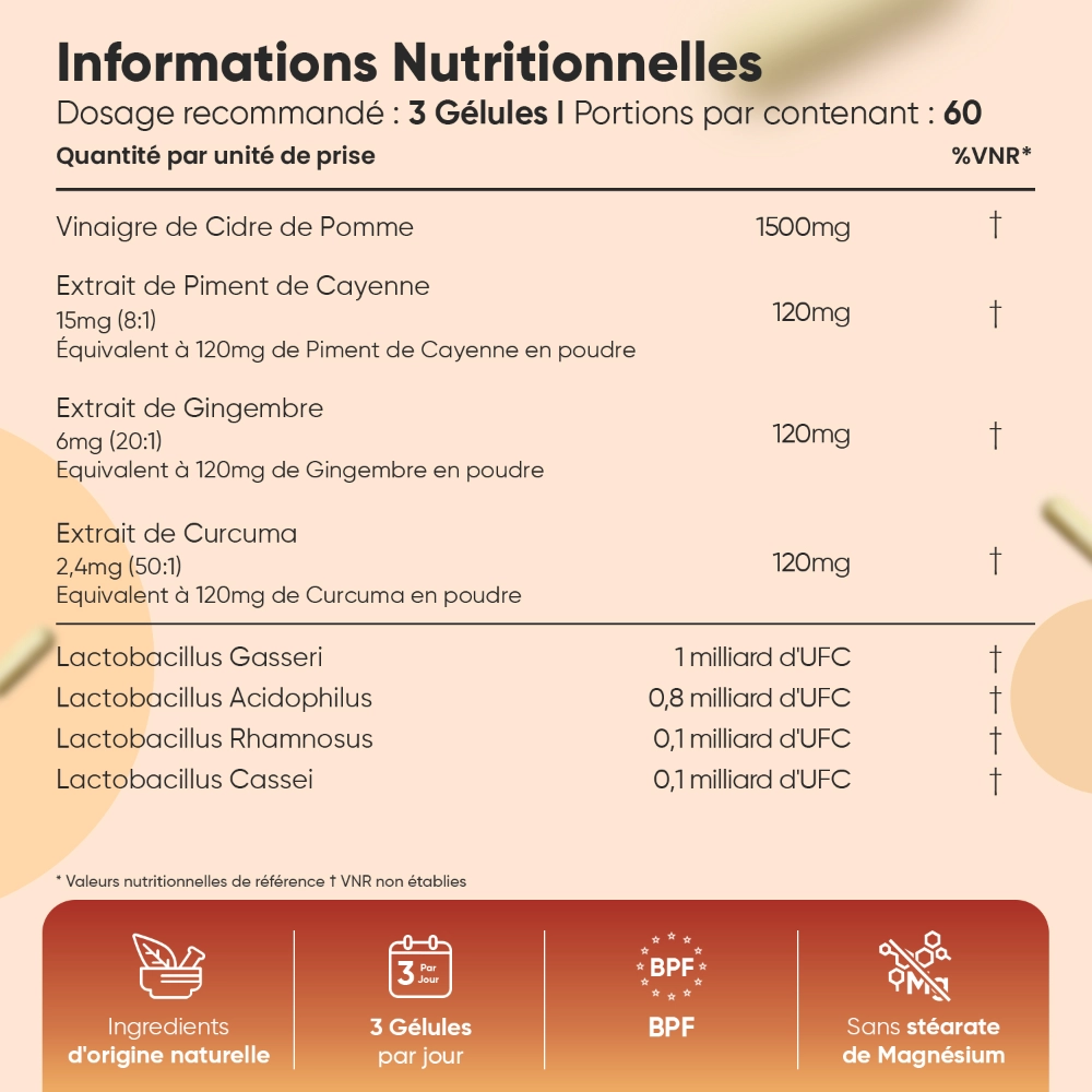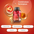 Présenté sous forme de gélules végétales, sans odeur ni goût acide, ce complément constitue une alternative agréable au vinaigre de cidre de pomme liquide, souvent difficile à consommer au quotidien.