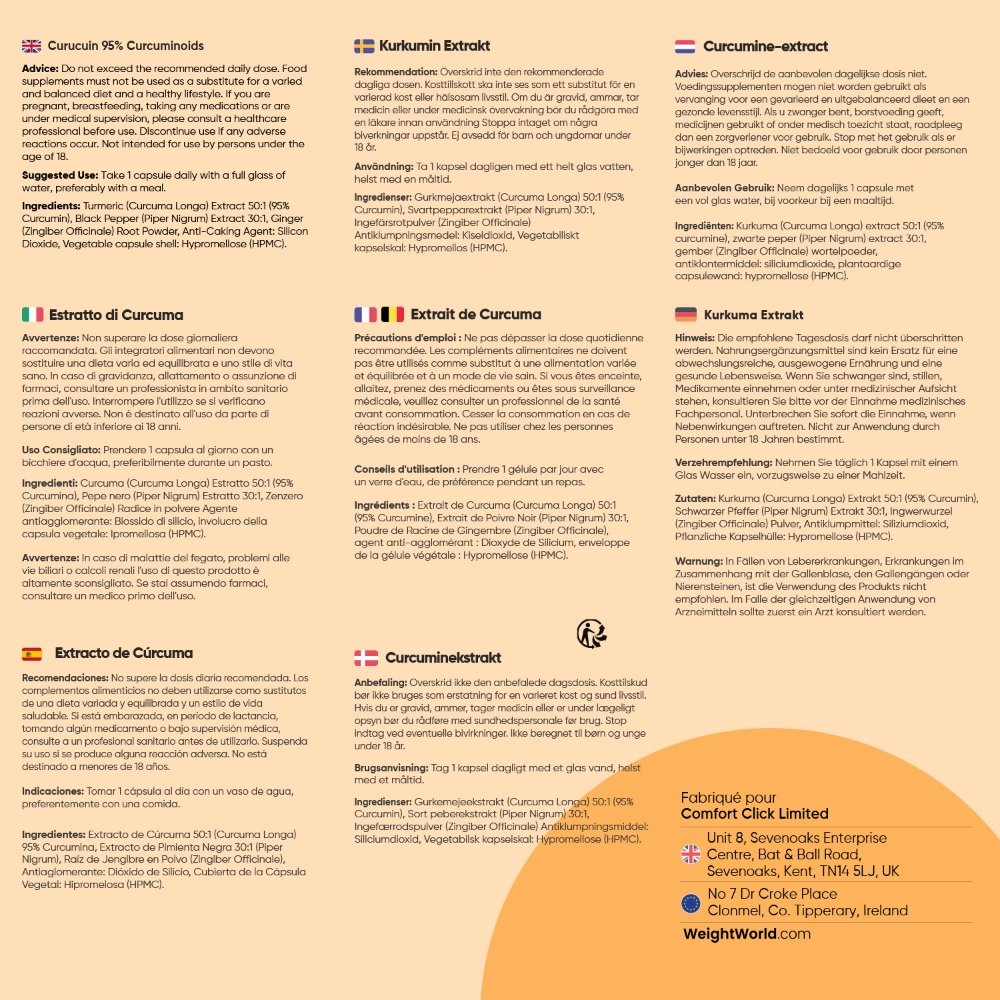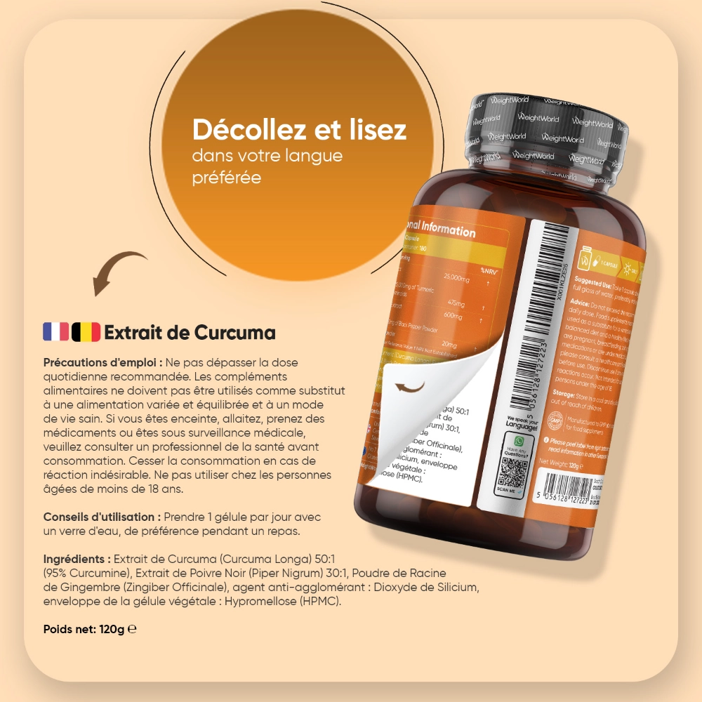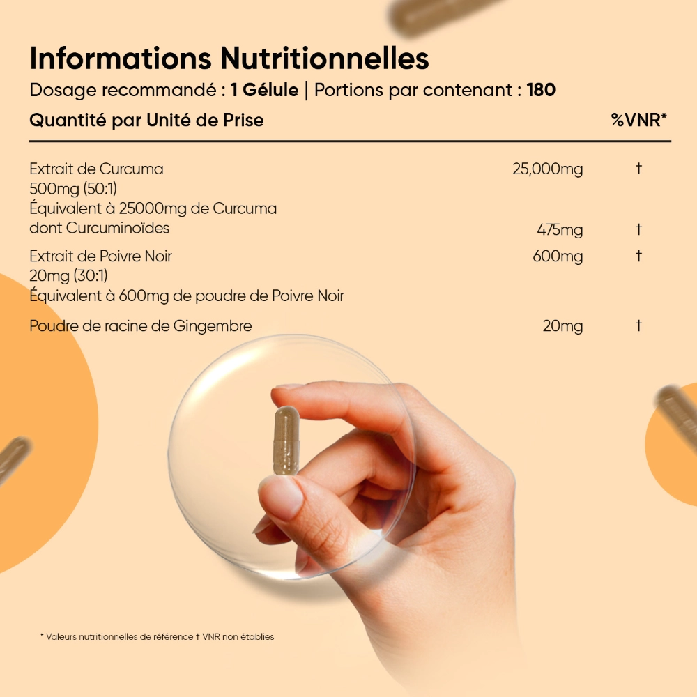 - Doses équivalentes à 25 000 mg de curcuma standardisé à 95% de curcuminoïdes