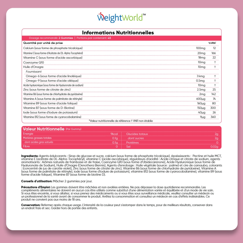 - 13 nutriments essentiels, incluant l'huile d'onagre et la coenzyme Q10