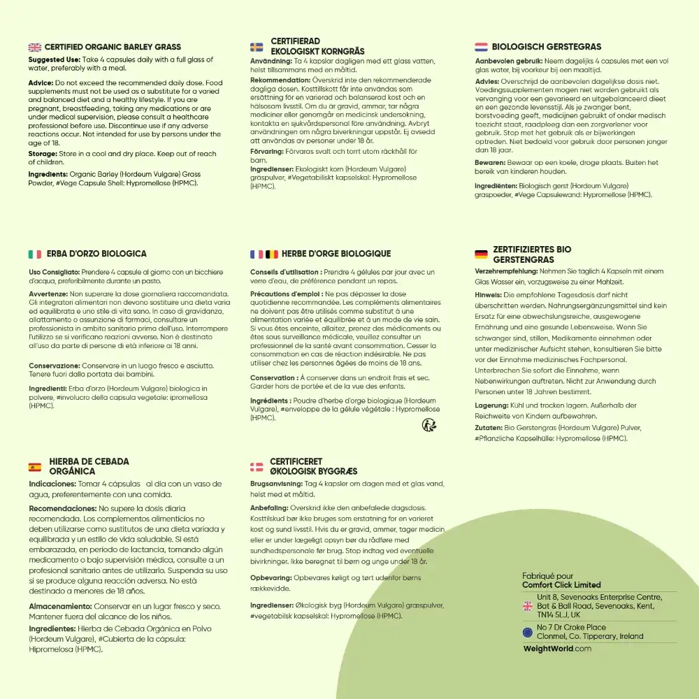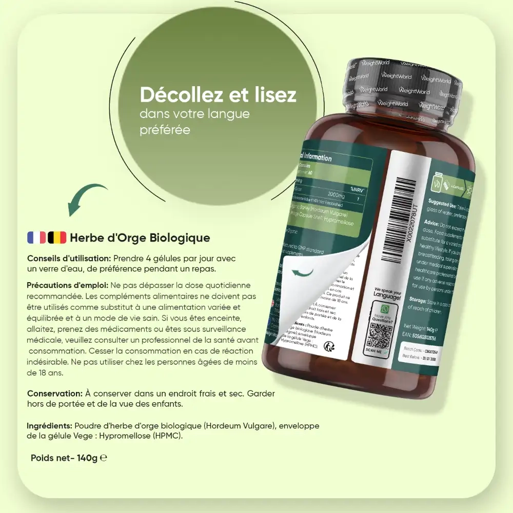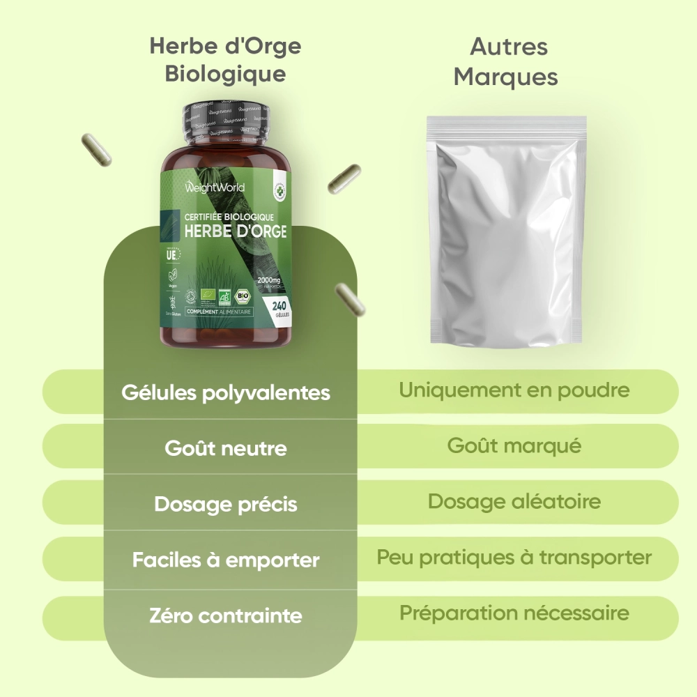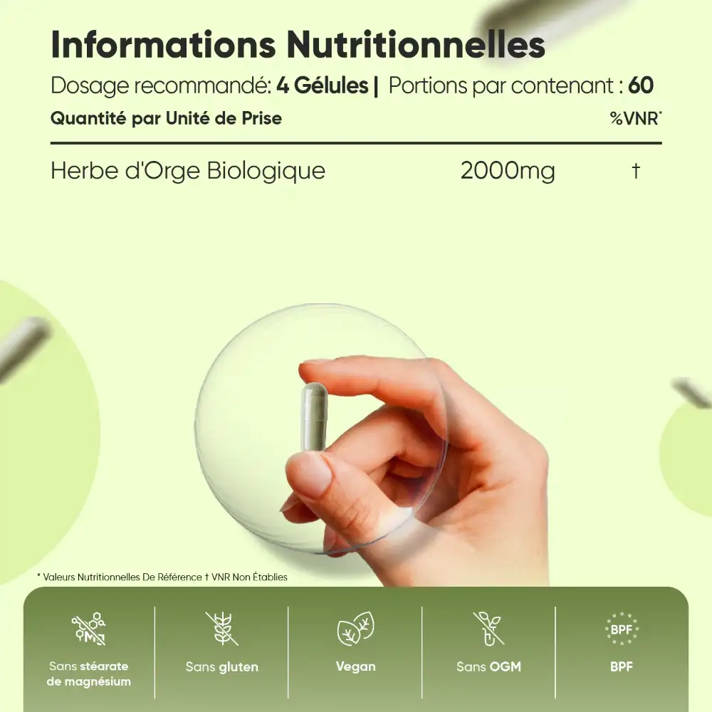 - Doses optimales offrant 2000 mg d'herbe d'orge en gélules
