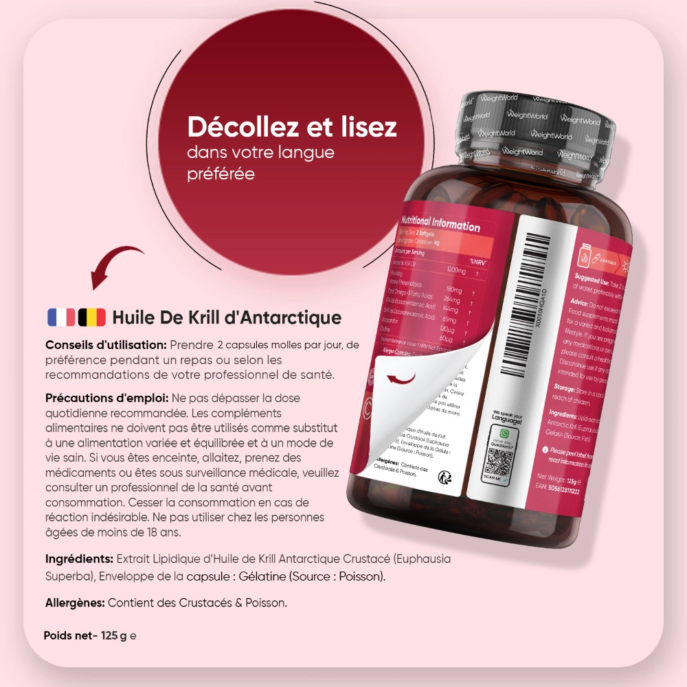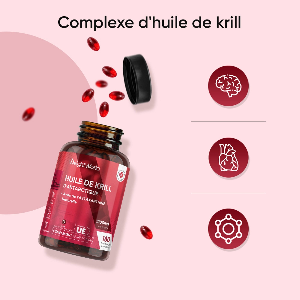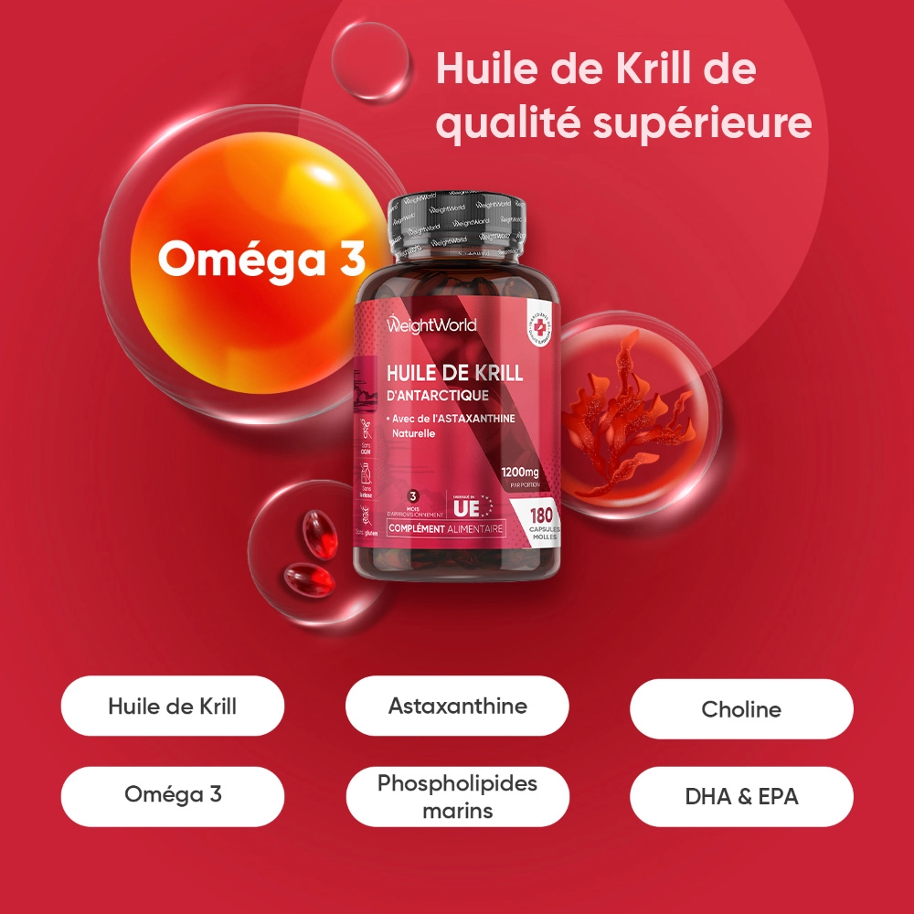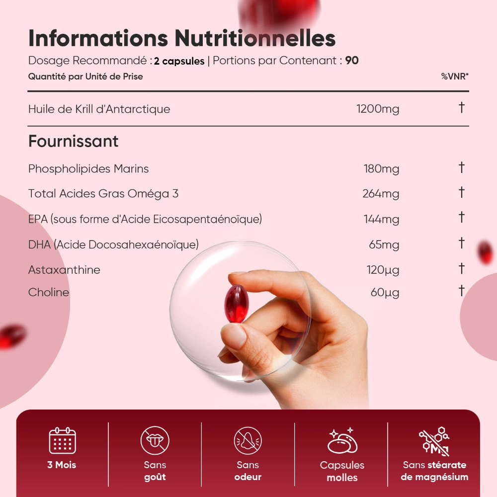 - Doses de 1200 mg d'Huile de Krill sourcées des eaux pures de l'Antarctique