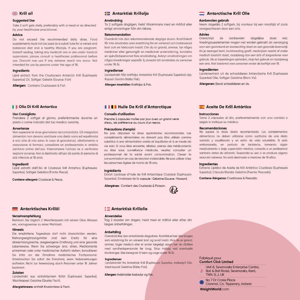 Pour tirer pleinement profit de l’Huile de Krill d'Antarctique de WeightWorld, prendre 2 capsules molles avec un grand verre d’eau, de préférence avant un repas.