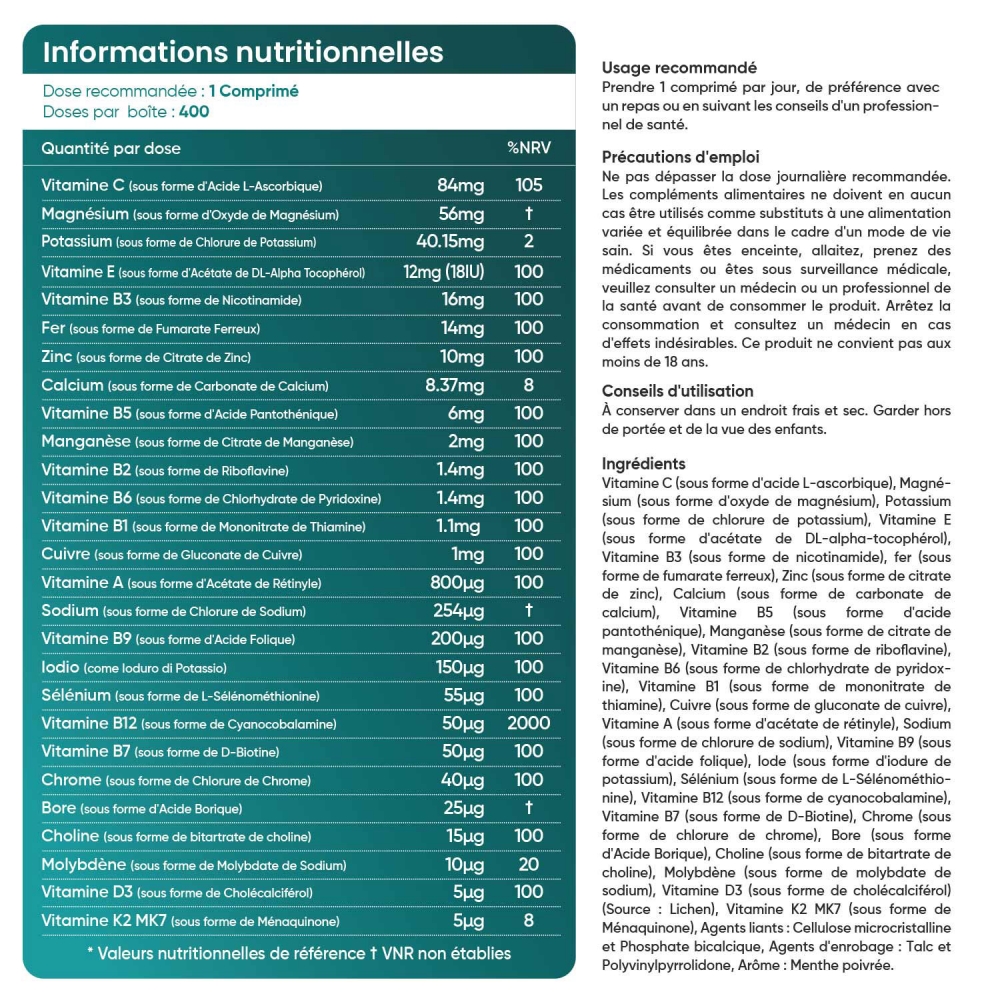 2000 mg 400 comprimés | Complexe de 27 nutriments essentiels