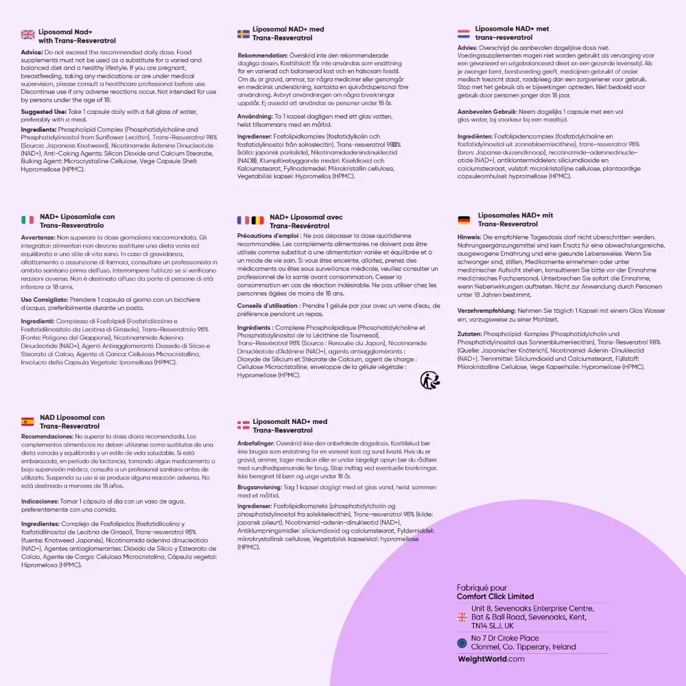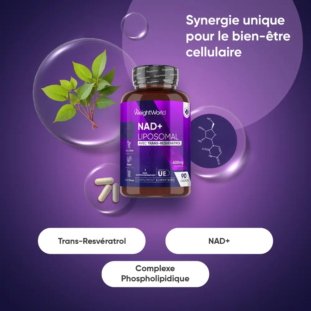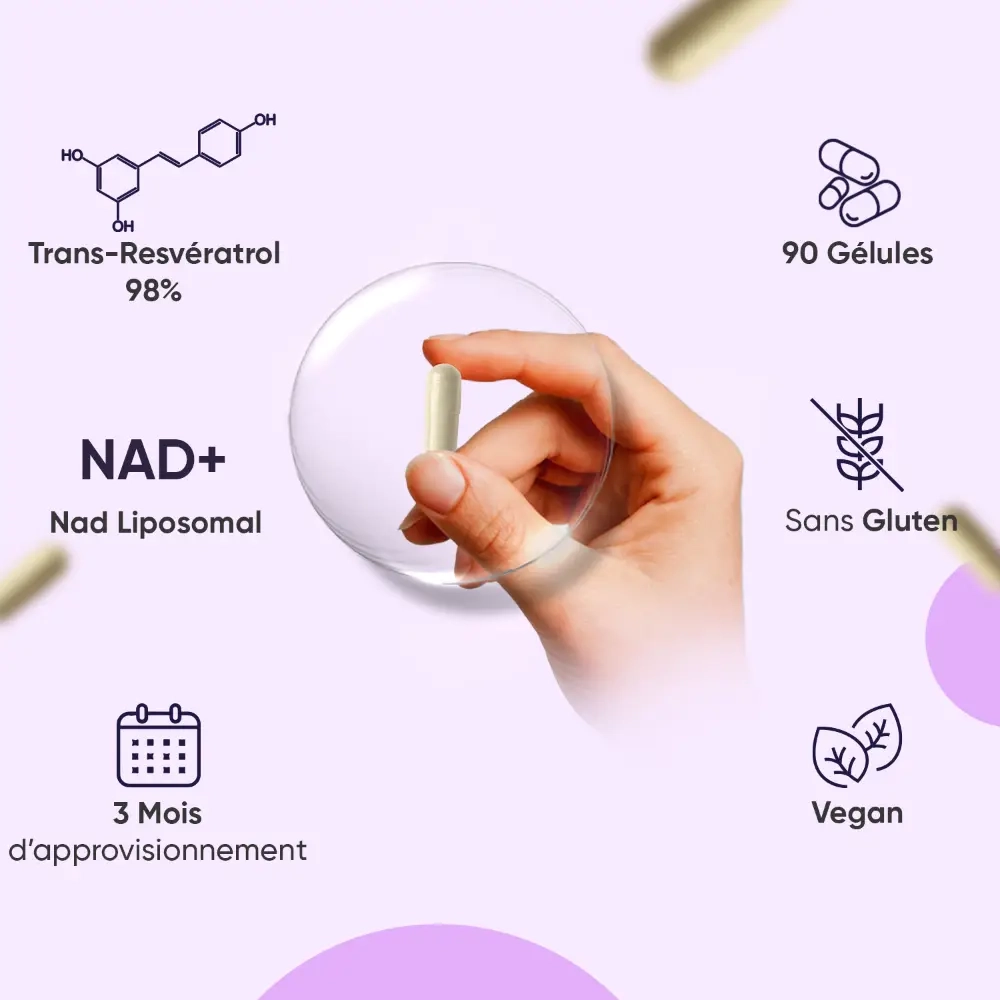 - Formule liposomale à haute biodisponibilité combinant NAD+ et Resvératrol pur à 98 %
