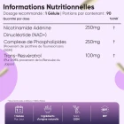 - 600 mg par gélule dont 250 mg de NAD+ et 100 mg de Resvératrol