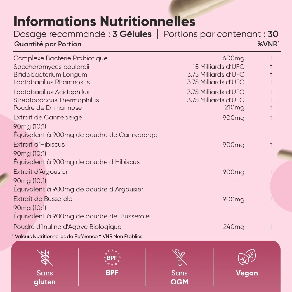 - Canneberge et D-mannose, traditionnellement utilisés pour le confort urinaire féminin*