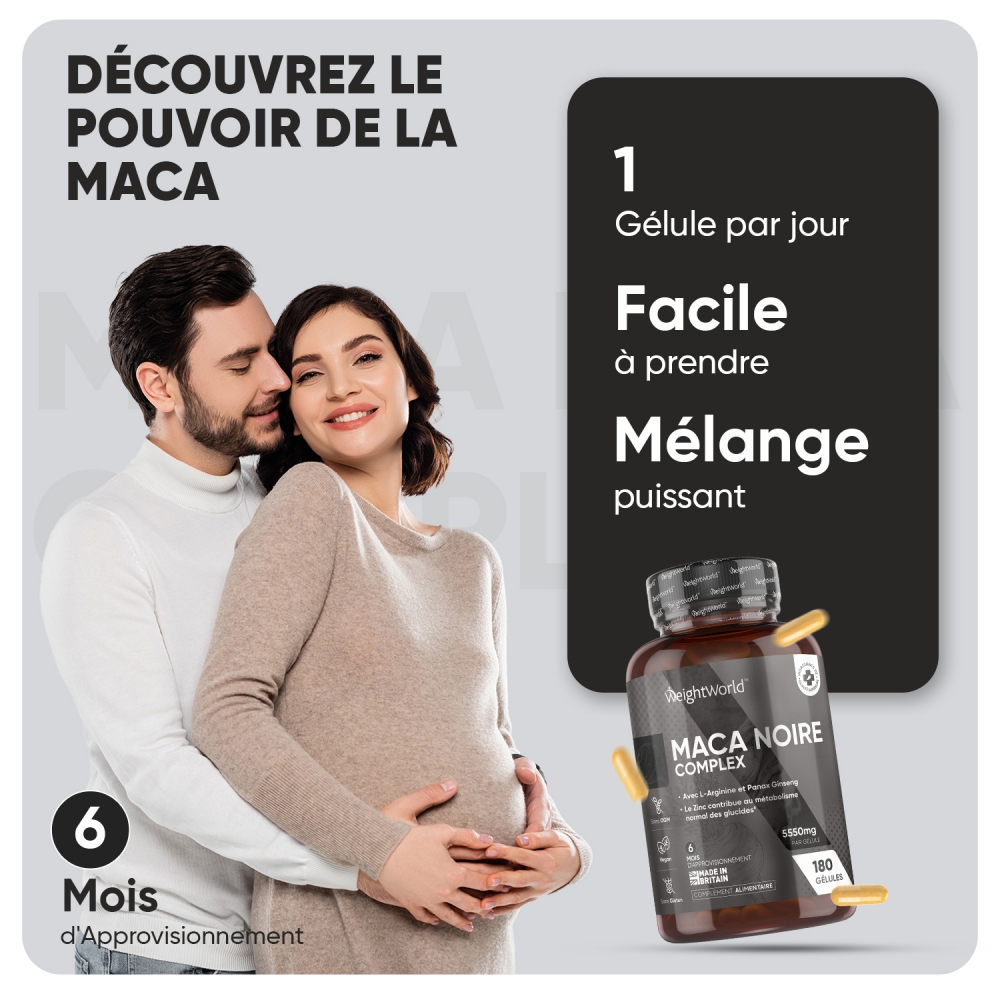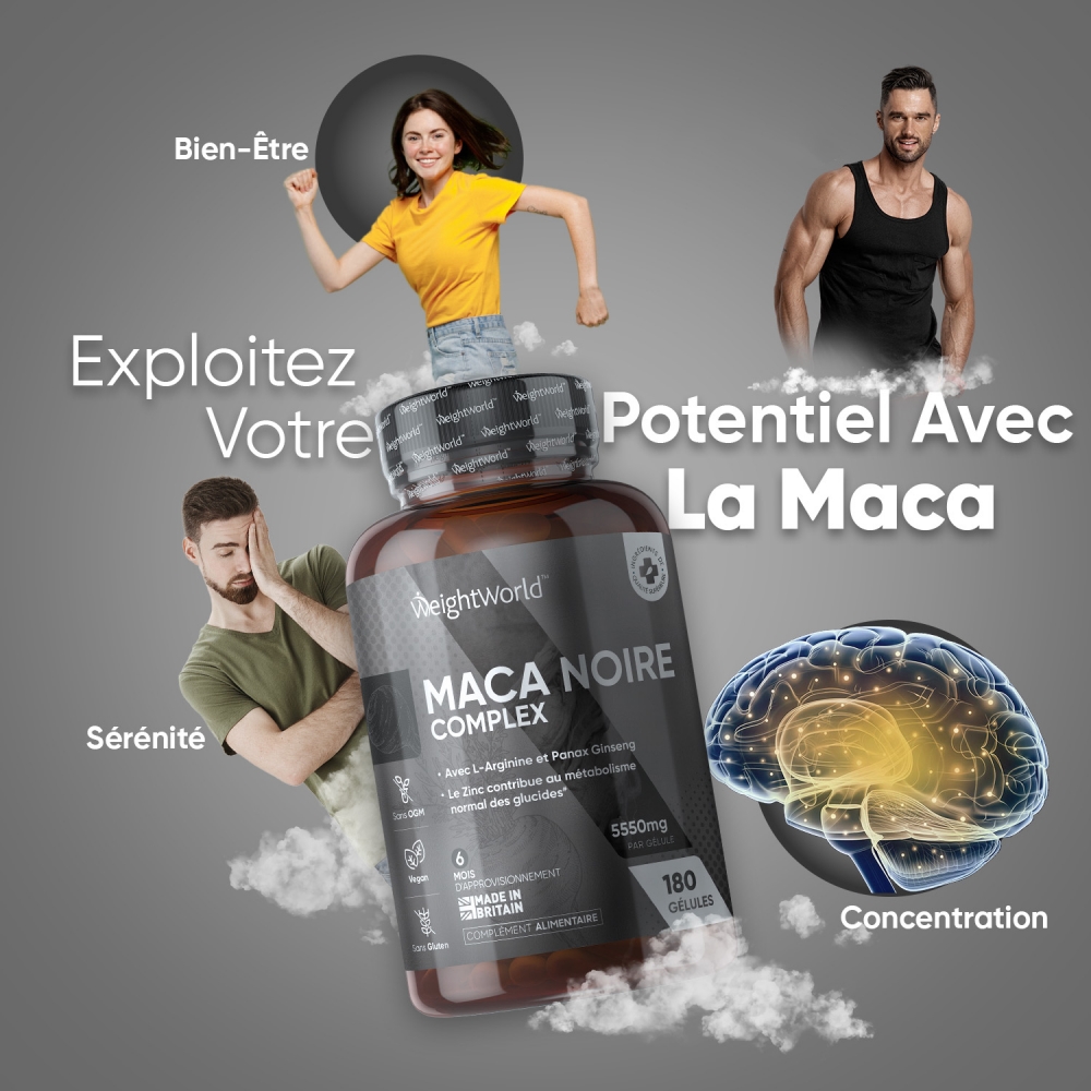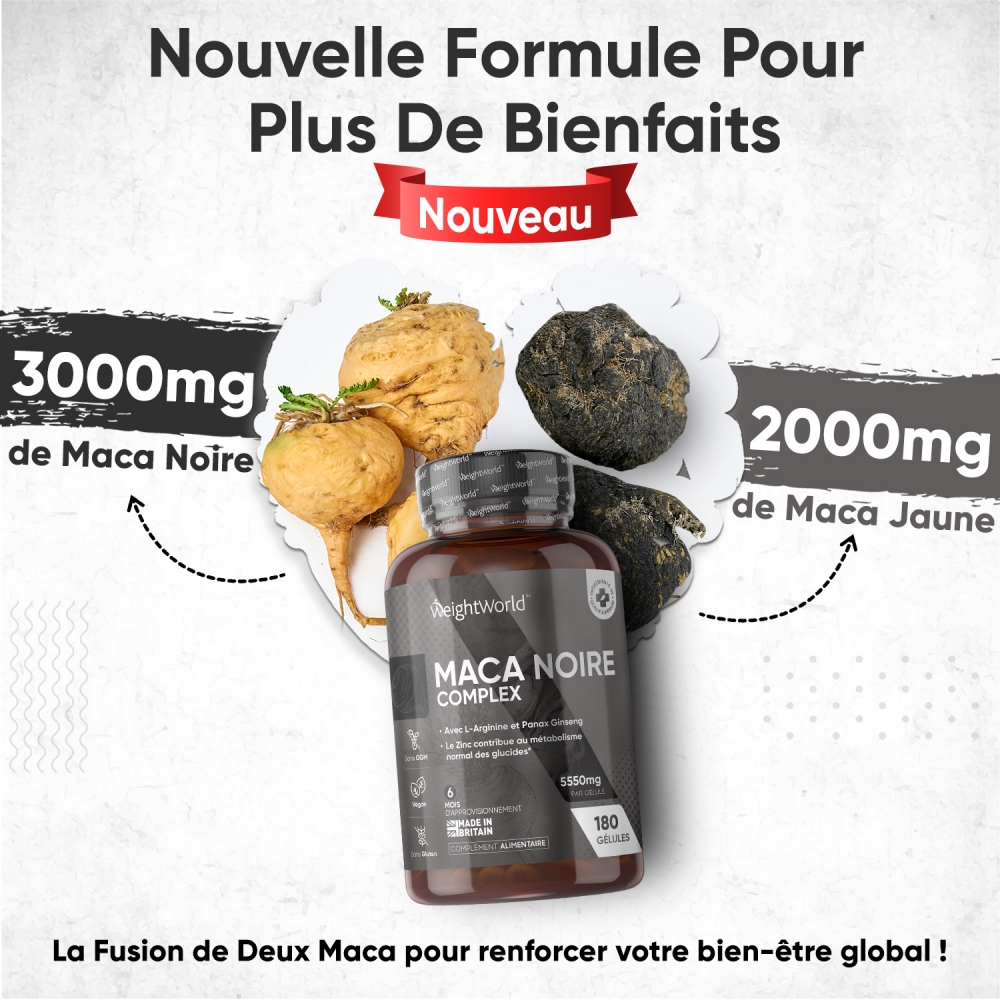 - Puissante combinaison de Maca Noire (3000 mg) et Maca Jaune (2000 mg)
