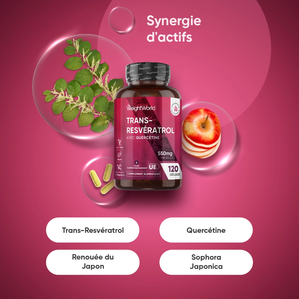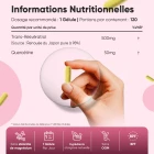 - Formule améliorée 2-en-1 : combine Trans-Resvératrol et quercétine dans un seul complément pour une action synergique.