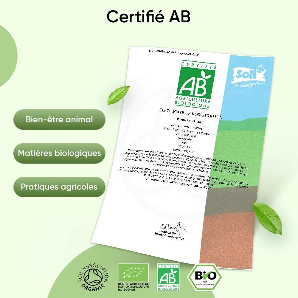 - Certifié Bio selon les standards européens, notamment français, allemands et britanniques.
