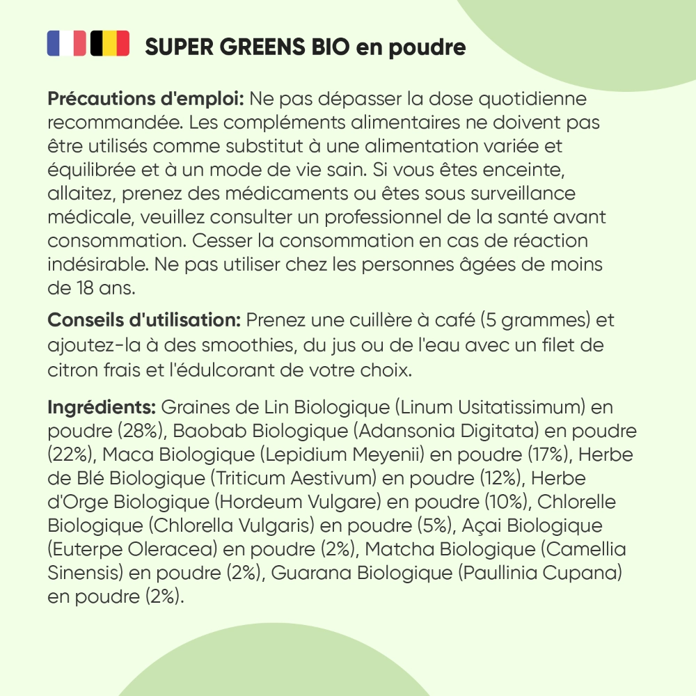 Super Greens Bio combine neuf super-ingrédients : lin, baobab, maca, herbe de blé (agropyre), herbe d’Orge,