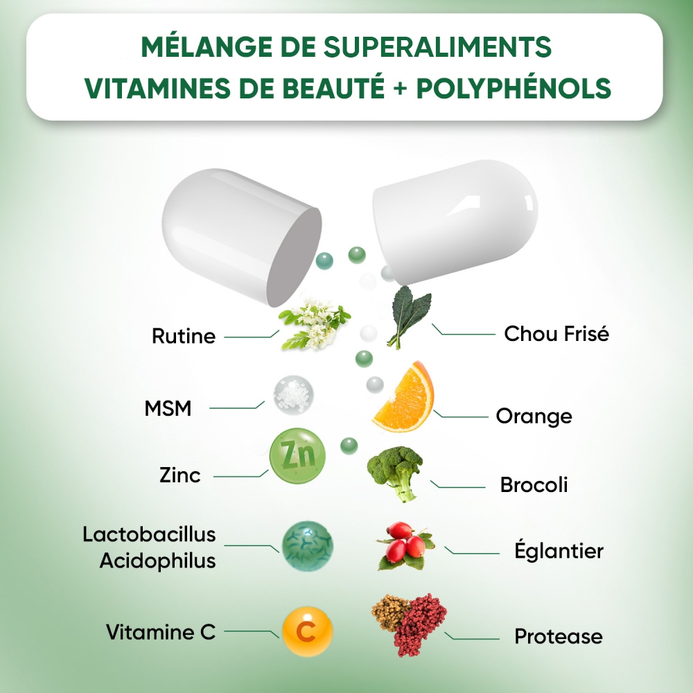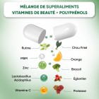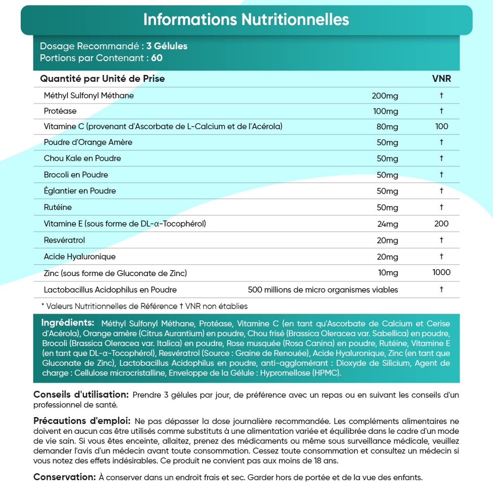 Chaque dose journalière (3 gélules) fournit de la vitamine C, issue de l’ascorbate de calcium et de l’acérola, du zinc (gluconate), et de la vitamine E (D-alpha-tocophérol). S’y ajoutent des actifs ciblés comme l’acide hyaluronique, le resvératrol (extrait de graines de renouée), la rutine, le MSM (Méthylsulfonylméthane), et la protéase, connus pour leur action complémentaire dans les routines anti-âge. La formule est également enrichie en extraits de plantes: poudre d’orange amère, de chou kale, de brocoli, et de rose musquée (églantier), réputés pour leur apport en antioxydants naturels*. Enfin, elle contient 500 millions d’UFC de Lactobacillus Acidophilus, une souche biotique qui soutient le bien-être digestif.
