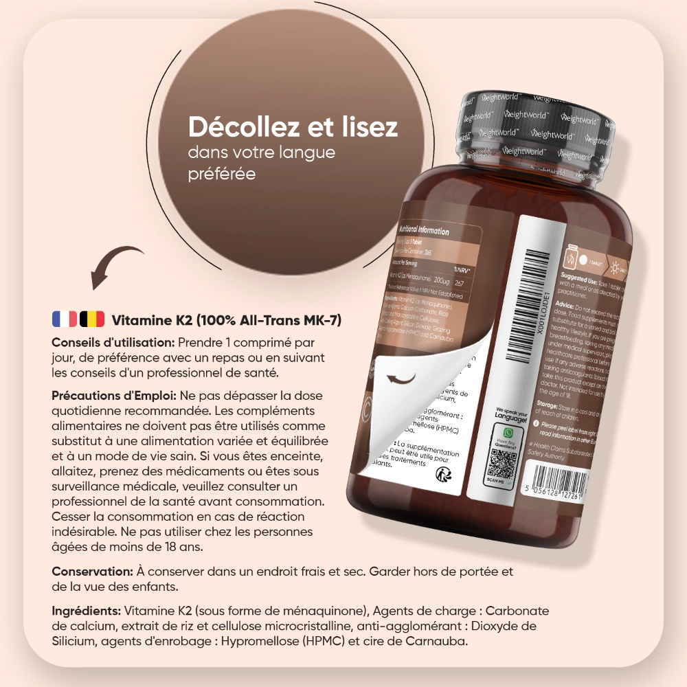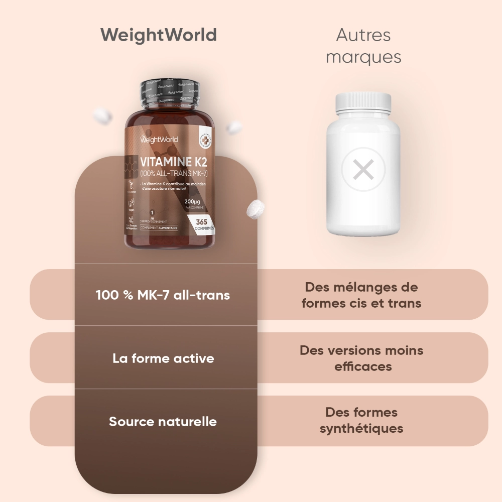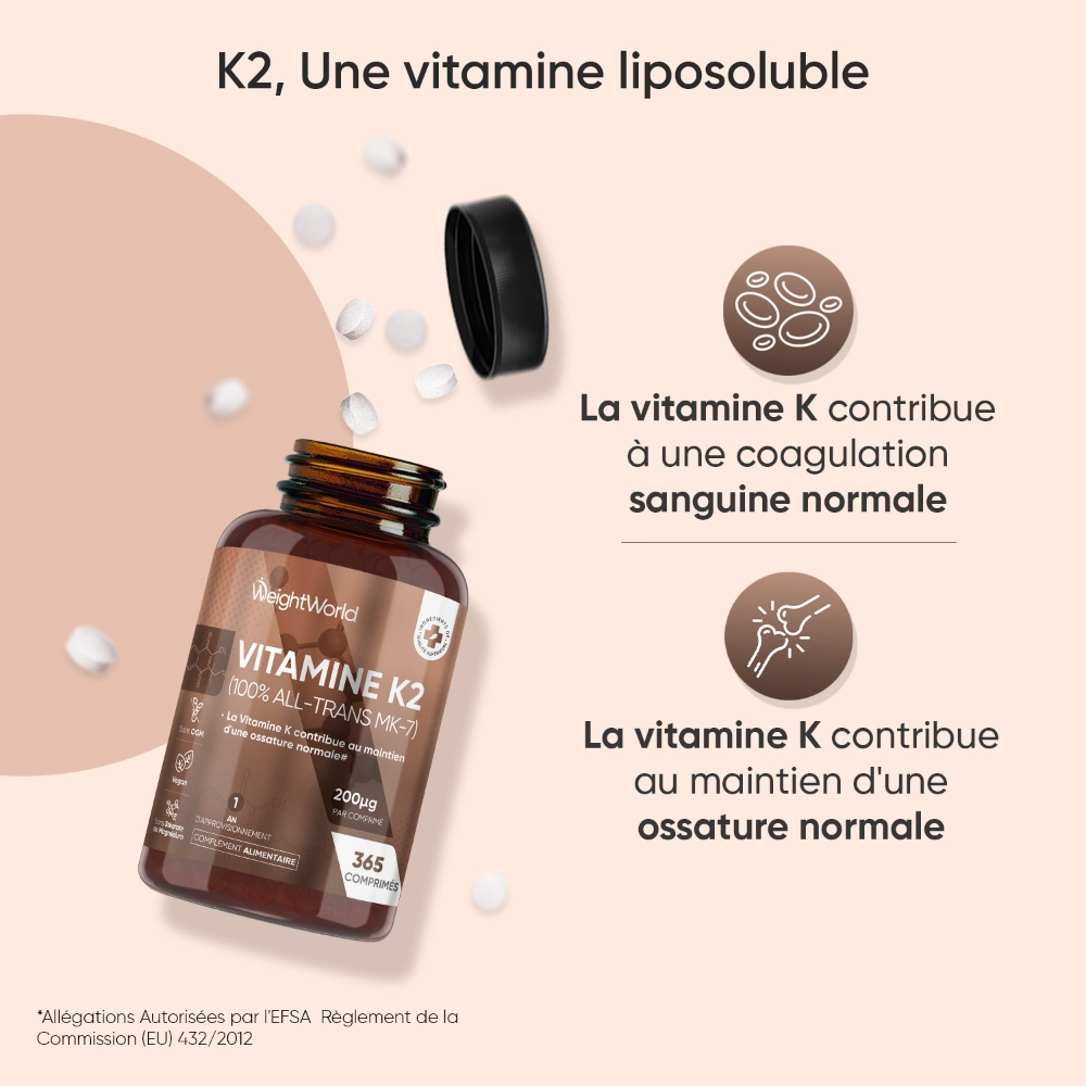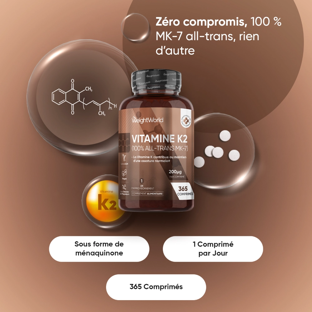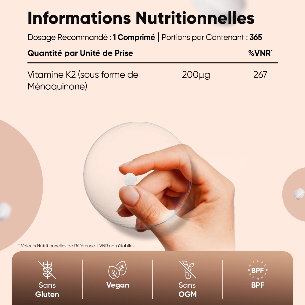- Dosage optimal de 200 µg de ménaquinone-7 (MK-7), forme active de la vitamine K2